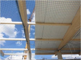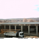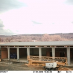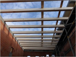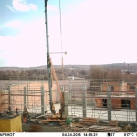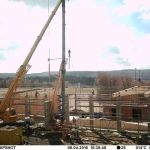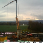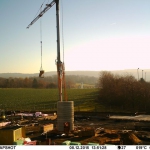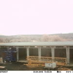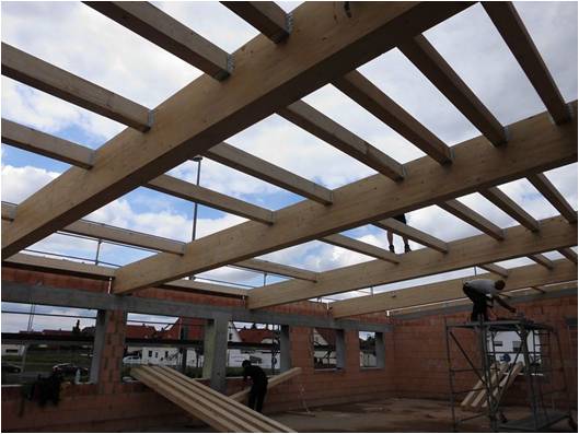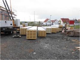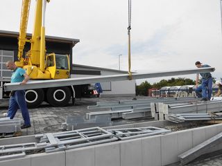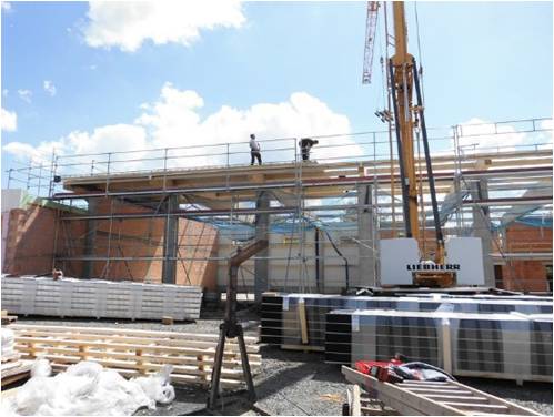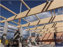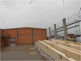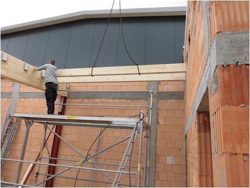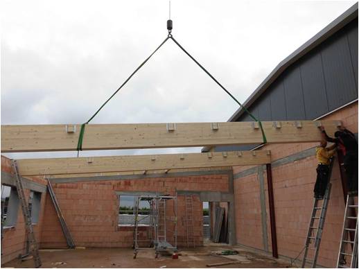 – Die Leimbinder werden auf die Stützpfeiler gelegt. Die Querbalken werden befestigt.