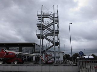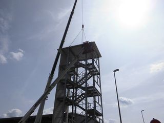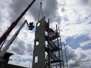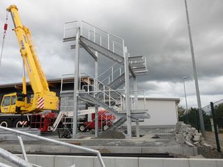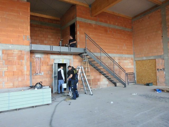 – Die Aufgangstreppe in der Fahrzeughalle wird installiert.