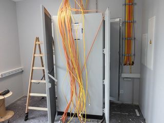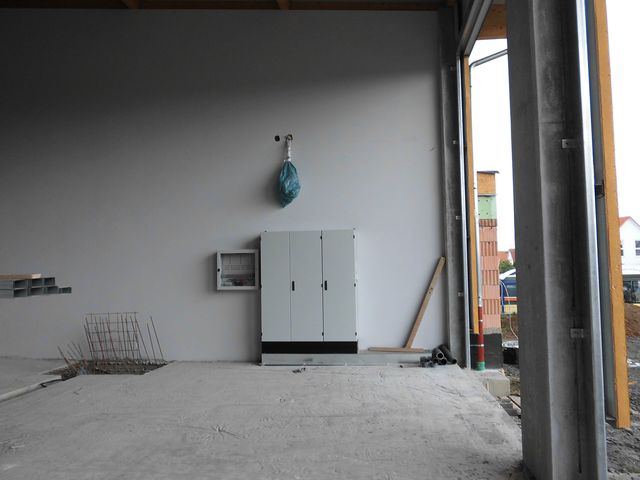 – Montage des Verteilerschranks in der Fahrzeughalle.