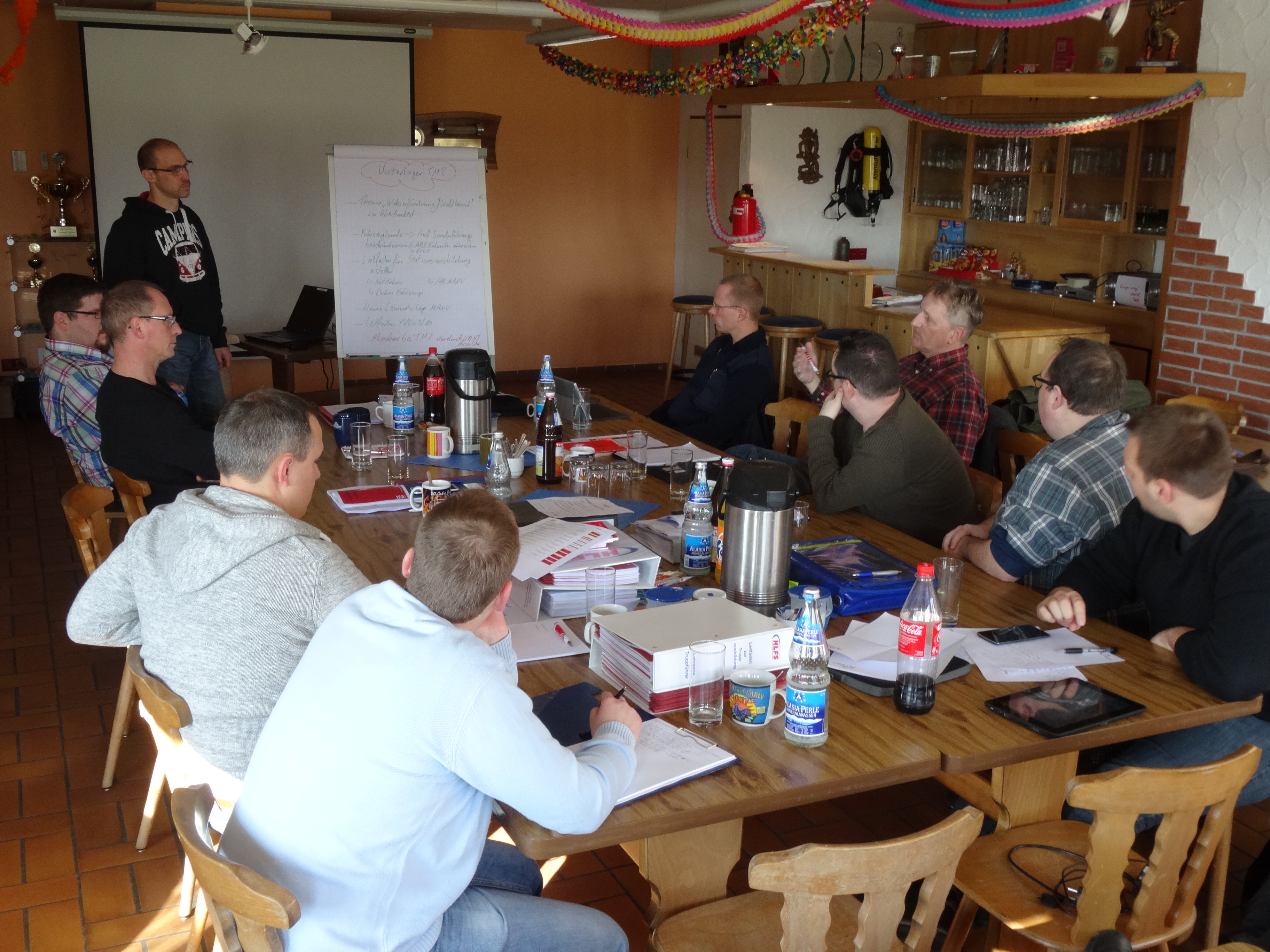 Bereits bei einem Vortreffen im Dezember wurden Themen für den Seminartag gesammelt. Unter der Fragestellung: „In welchen Themenbereichen und warum gibt es immer wieder Probleme bei den Lehrgängen?!“, ging es anschließend in Kleingruppen weiter. Teilnehmer- und Lehrunterlagen wurden gewälzt, Ideen der verschiedenen Standorte gesammelt und für die bessere Abstimmung Leitfäden erarbeitet. Durch die geografische Teilung des Landkreises in Ausbilder-Teams „West“ und „Ost“ war es besonders interessant sich standortübergreifend intensiv auszutauschen.