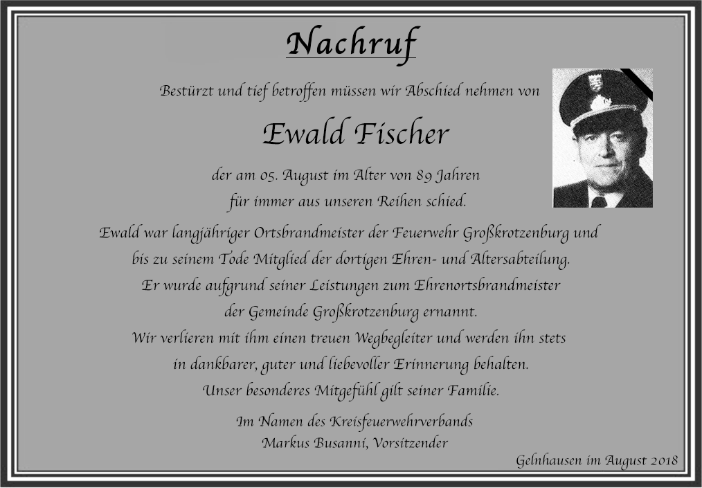 Zeige grösseres Bild Trauer um Ewald Fischer Von FFMKK Administration|8. August 2018| Über den Autor: FFMKK Administration Ähnliche Beiträge Einladung zum Kreisfeuerwehrtag 50 Jahre Kreisfeuerwehrverband Main-Kinzig Gallerie Einladung zum Kreisfeuerwehrtag 50 Jahre Kreisfeuerwehrverband Main-Kinzig Trauer um Erich Bös Gallerie Trauer um Erich Bös Trauer um Erhard Winter Gallerie Trauer um Erhard Winter Trauer um Dieter Spahn Gallerie Trauer um Dieter Spahn Trauer um KBM a.D. Winfried Kirchner Gallerie Trauer um KBM a.D. Winfried Kirchner