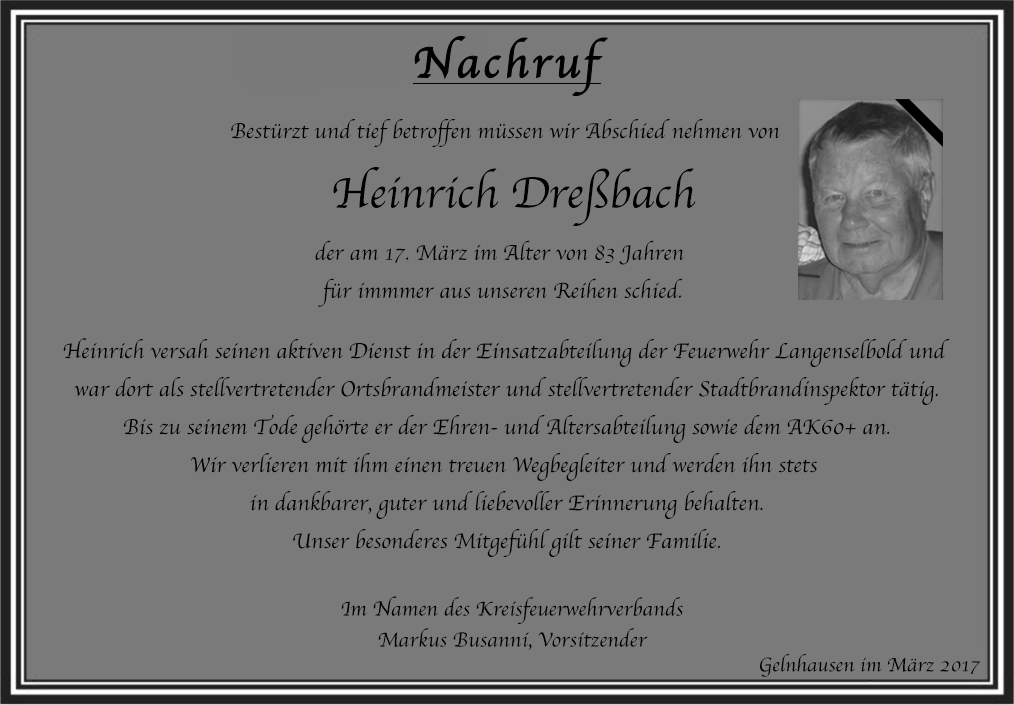 Zeige grösseres Bild Trauer um Heinrich Dreßbach Von FFMKK Administration|23. März 2017| Über den Autor: FFMKK Administration Ähnliche Beiträge Einladung zum Kreisfeuerwehrtag 50 Jahre Kreisfeuerwehrverband Main-Kinzig Gallerie Einladung zum Kreisfeuerwehrtag 50 Jahre Kreisfeuerwehrverband Main-Kinzig Trauer um Erich Bös Gallerie Trauer um Erich Bös Trauer um Erhard Winter Gallerie Trauer um Erhard Winter Trauer um Dieter Spahn Gallerie Trauer um Dieter Spahn Trauer um KBM a.D. Winfried Kirchner Gallerie Trauer um KBM a.D. Winfried Kirchner