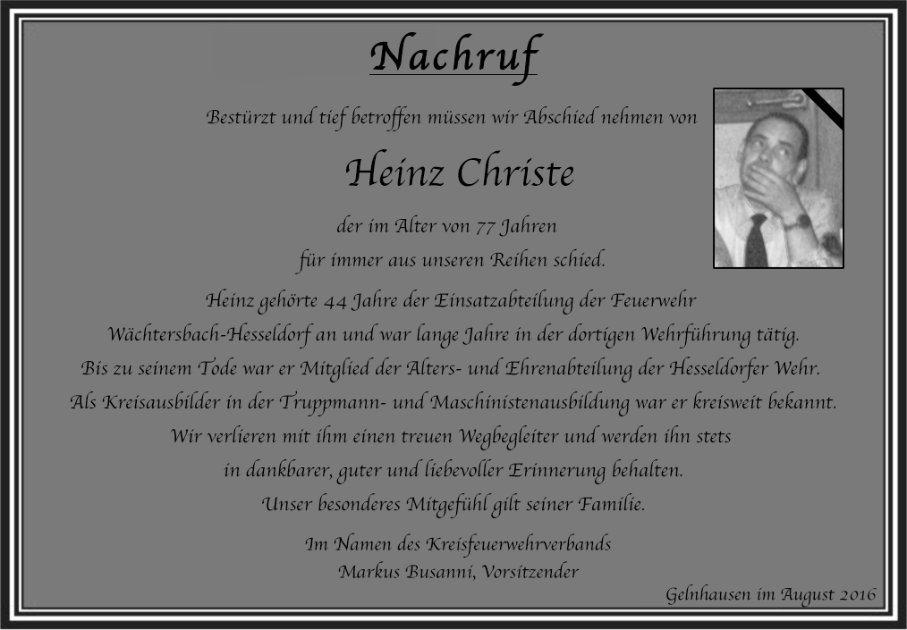 Zeige grösseres Bild Trauer um Heinz Christe Von FFMKK Administration|7. September 2016| Über den Autor: FFMKK Administration Ähnliche Beiträge Einladung zum Kreisfeuerwehrtag 50 Jahre Kreisfeuerwehrverband Main-Kinzig Gallerie Einladung zum Kreisfeuerwehrtag 50 Jahre Kreisfeuerwehrverband Main-Kinzig Trauer um Erich Bös Gallerie Trauer um Erich Bös Trauer um Erhard Winter Gallerie Trauer um Erhard Winter Trauer um Dieter Spahn Gallerie Trauer um Dieter Spahn Trauer um KBM a.D. Winfried Kirchner Gallerie Trauer um KBM a.D. Winfried Kirchner