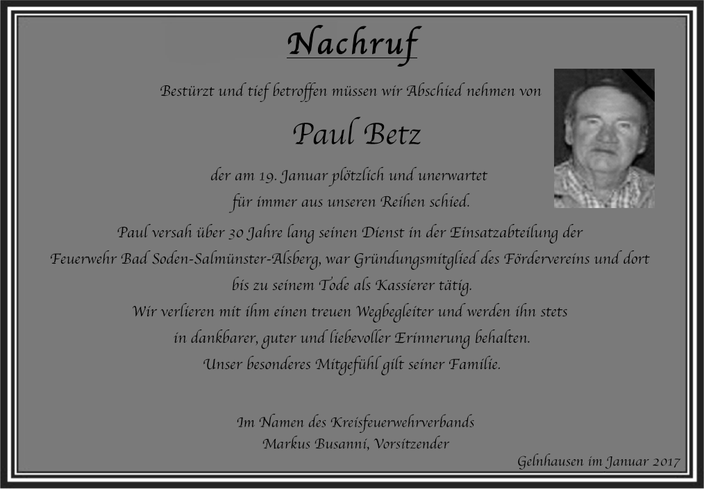 Zeige grösseres Bild Trauer um Paul Betz Von FFMKK Administration|31. Januar 2017| Über den Autor: FFMKK Administration Ähnliche Beiträge Einladung zum Kreisfeuerwehrtag 50 Jahre Kreisfeuerwehrverband Main-Kinzig Gallerie Einladung zum Kreisfeuerwehrtag 50 Jahre Kreisfeuerwehrverband Main-Kinzig Trauer um Erich Bös Gallerie Trauer um Erich Bös Trauer um Erhard Winter Gallerie Trauer um Erhard Winter Trauer um Dieter Spahn Gallerie Trauer um Dieter Spahn Trauer um KBM a.D. Winfried Kirchner Gallerie Trauer um KBM a.D. Winfried Kirchner