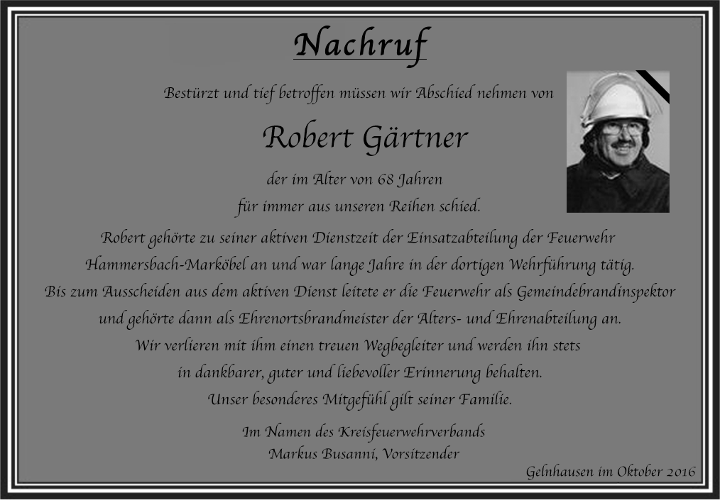 Zeige grösseres Bild Trauer um Robert Gärtner Von FFMKK Administration|21. Oktober 2016| Über den Autor: FFMKK Administration Ähnliche Beiträge Einladung zum Kreisfeuerwehrtag 50 Jahre Kreisfeuerwehrverband Main-Kinzig Gallerie Einladung zum Kreisfeuerwehrtag 50 Jahre Kreisfeuerwehrverband Main-Kinzig Trauer um Erich Bös Gallerie Trauer um Erich Bös Trauer um Erhard Winter Gallerie Trauer um Erhard Winter Trauer um Dieter Spahn Gallerie Trauer um Dieter Spahn Trauer um KBM a.D. Winfried Kirchner Gallerie Trauer um KBM a.D. Winfried Kirchner