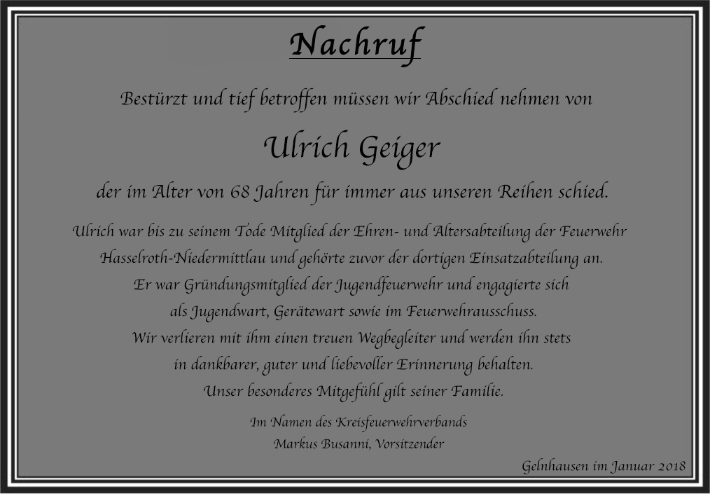 Zeige grösseres Bild Trauer um Ulrich Geiger Von FFMKK Administration|22. Januar 2018| Über den Autor: FFMKK Administration Ähnliche Beiträge Einladung zum Kreisfeuerwehrtag 50 Jahre Kreisfeuerwehrverband Main-Kinzig Gallerie Einladung zum Kreisfeuerwehrtag 50 Jahre Kreisfeuerwehrverband Main-Kinzig Trauer um Erich Bös Gallerie Trauer um Erich Bös Trauer um Erhard Winter Gallerie Trauer um Erhard Winter Trauer um Dieter Spahn Gallerie Trauer um Dieter Spahn Trauer um KBM a.D. Winfried Kirchner Gallerie Trauer um KBM a.D. Winfried Kirchner