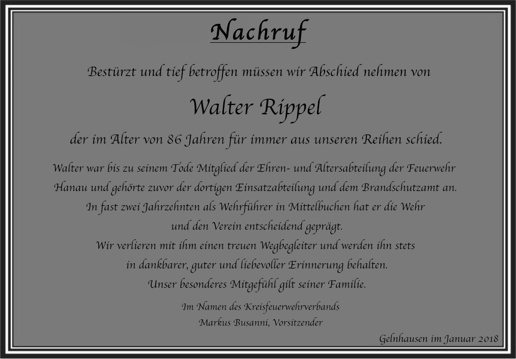 Zeige grösseres Bild Trauer um Walter Rippel Von FFMKK Administration|22. Januar 2018| Über den Autor: FFMKK Administration Ähnliche Beiträge Einladung zum Kreisfeuerwehrtag 50 Jahre Kreisfeuerwehrverband Main-Kinzig Gallerie Einladung zum Kreisfeuerwehrtag 50 Jahre Kreisfeuerwehrverband Main-Kinzig Trauer um Erich Bös Gallerie Trauer um Erich Bös Trauer um Erhard Winter Gallerie Trauer um Erhard Winter Trauer um Dieter Spahn Gallerie Trauer um Dieter Spahn Trauer um KBM a.D. Winfried Kirchner Gallerie Trauer um KBM a.D. Winfried Kirchner